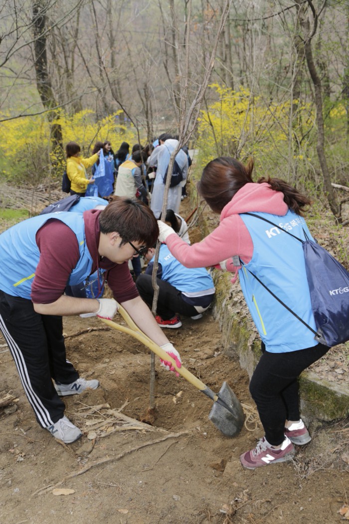 한편, KT&G복지재단은 보다 효과적인 사회복지 실천을 위해 KT&G가 지난 2003년 설립한 사회복지법인이다. 지역 밀착 맞춤형 서비스를 제공하는 8개의 '행복네트워크 복지센터'를 운영하고 있다.KT&G복지재단과 대학생 자원봉사자들이 '북한산 자생종 나무 700그루 심기'에 참여하고 있다.<사진제공=KT&G>