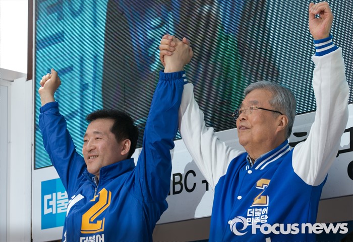 (서울=포커스뉴스) 김종인(오른쪽) 더불어민주당 비대위 대표 겸 선대위원장이 10일 오전 서울 석촌호수 서호 인근 거리에서 지원유세를 마친 뒤 최명길 송파을 후보와 손을 들어 포즈를 취하고 있다.
