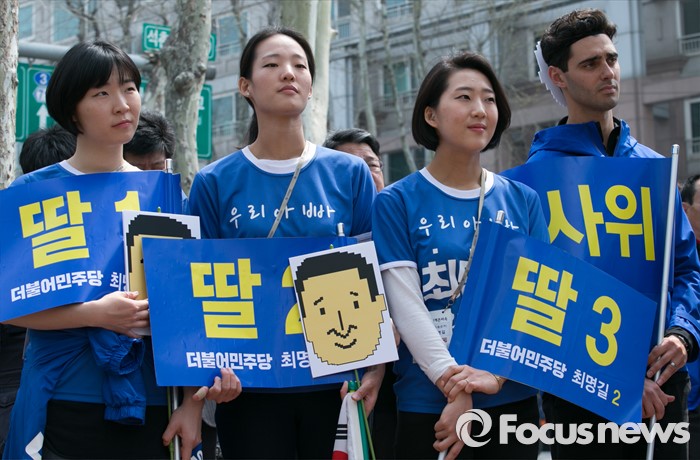 (서울=포커스뉴스) 최명길 더불어민주당 송파을 후보의 가족들이 10일 오전 서울 석촌호수 서호 인근 거리에서 김종인 비대위 대표 겸 선대위원장의 지원유세를 지켜보고 있다.