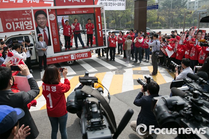 (서울=포커스뉴스) 김무성 새누리당 대표가 10일 오전 서울 강동구 양재대로 둔촌시장 앞에서 이재영 강동을 후보 지원유세를 하고 있다.