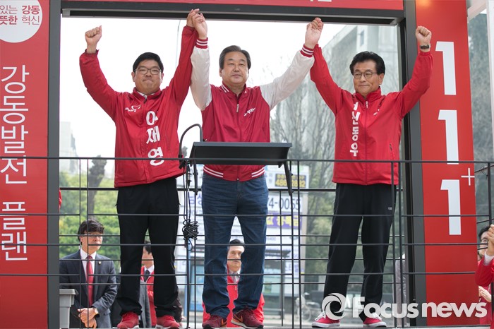 (서울=포커스뉴스) 김무성(가운데) 새누리당 대표가 10일 오전 서울 강동구 양재대로 둔촌시장 앞에서 이재영(왼쪽) 강동을, 신동우 강동갑 후보와 손을 잡고 있다.