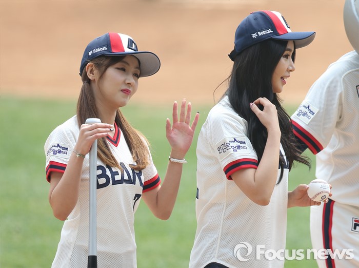 (서울=포커스뉴스) 10일 서울 잠실구장에서 열린 2016 프로야구 넥센-두산 경기에서 시구 및 시타로 나선 걸그룹 피에스타의 차오루(오른쪽)와 혜미가 관중에게 인사하고 있다.
