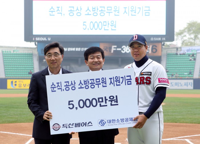 두산은 9일 넥센과의 경기에 앞서 대한소방공제회에 '순직·공상 소방공무원 지원기금'으로 5000만원을 전달했다. 지난 5일 NC와의 경기 전에는 세계적인 아동구호기관 세이브더칠드런에 '학대피해아동 보호 및 지원기금'으로 5000만원을 전했다.