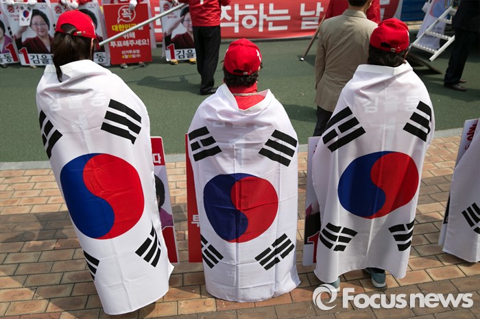 (서울=포커스뉴스) 10일 오전 서울 송파구 성내천 물빛광장에서 새누리당 선거운동원들이 태극기를 몸에 두르고 있다.