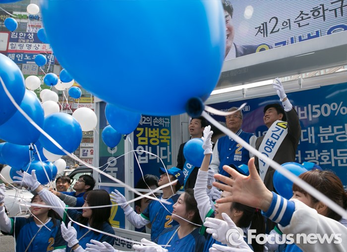 (성남=포커스뉴스) 10일 오후 경기도 성남 미금역 앞에서 열린 더불어민주당 분당 합동유세에 참석한 김종인 비대위 대표 겸 선대위원장과 후보들이 풍선을 날리는 퍼포먼스를 하고 있다. 왼쪽부터 김병관 분당갑 후보, 김 대표, 김병욱 분당을 후보.
