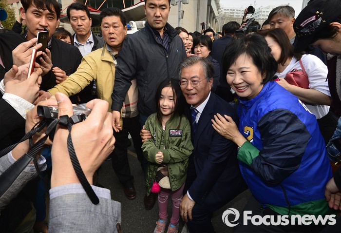 (서울=포커스뉴스) 문재인 더불어민주당 전 대표가 10일 오후 서울 마포구 홍익대학교 앞에서 손혜원 더불어민주당 마포을 후보의 지지를 호소하고 있다.