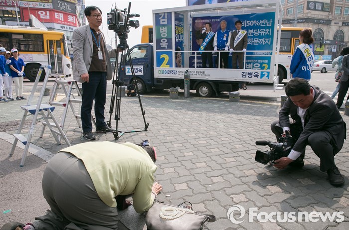 (성남=포커스뉴스) 10일 오후 경기도 성남 미금역 앞에서 열린 더불어민주당 분당 합동유세에 참석한 김종인 비대위 대표 겸 선대위원장과 후보들의 선거유세를 지켜보던 한 어르신이 절을 하고 있다.