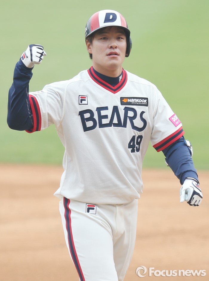 (서울=포커스뉴스) 10일 서울 잠실구장에서 열린 2016 프로야구 넥센-두산 경기 4회말 2사 1,3루에서 두산 민병헌이 1타점 좌전안타를 치고 주먹을 불끈 쥐며 기뻐하고 있다.