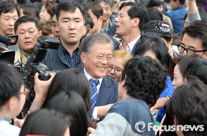 (서울=포커스뉴스) 문재인 더불어민주당 전 대표가 10일 오후 서울 마포구 홍익대학교 앞에서 손혜원 더불어민주당 마포을 후보의 지지를 호소하며 차량으로 향하고 있다.