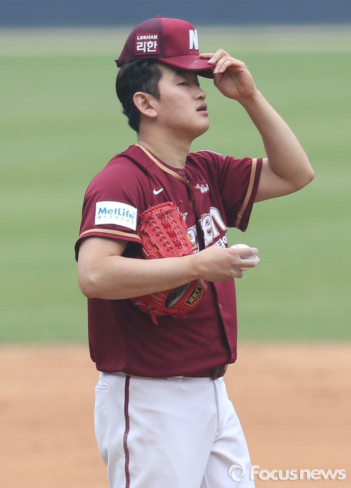 (서울=포커스뉴스) 10일 서울 잠실구장에서 열린 2016 프로야구 넥센-두산 경기 6회말 넥센 투수 양훈이 두산 선두타자 박건우에게 2루타를 맞고 모자를 고쳐 쓰고 있다.