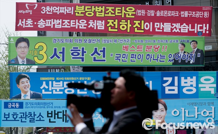 (성남=포커스뉴스) 20대 총선 사흘 앞둔 10일 오후 경기도 성남 미금역 앞 거리에 각 정당 후보들의 현수막이 걸려 있다.