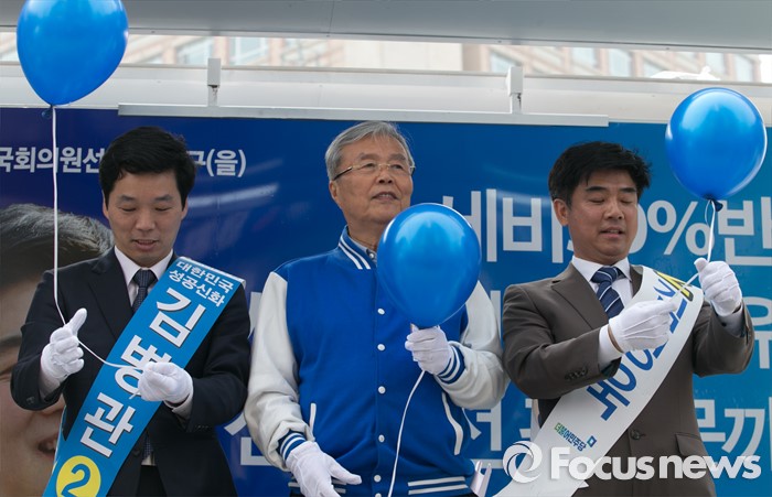 (성남=포커스뉴스) 10일 오후 경기도 성남 미금역 앞에서 열린 더불어민주당 분당 합동유세에 참석한 김종인(가운데) 비대위 대표 겸 선대위원장과 김병관(왼쪽) 분당갑, 김병욱 분당을 후보가 풍선을 날리는 퍼포먼스를 준비하고 있다.