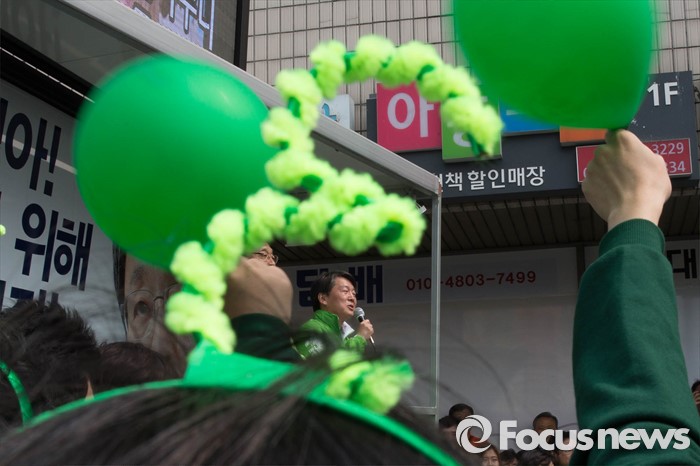 (서울=포커스뉴스) 20대 총선을 3일 앞둔 10일 오후 서울 관악구 관악프라자 인근에서 안철수 국민의당 공동대표가 김성식 관악구갑 후보 지원유세를 하고 있다.