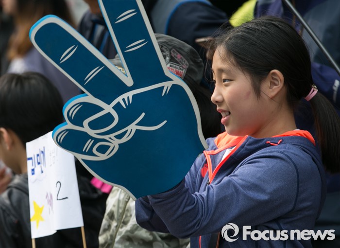 (용인=포커스뉴스) 10일 오후 경기도 기흥구청 인근 거리에서 어린이들이 김민기 더불어민주당 용인을 후보의 지지를 호소하고 있다.