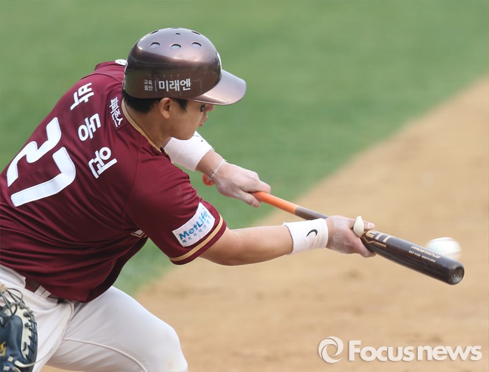 (서울=포커스뉴스) 10일 서울 잠실구장에서 열린 2016 프로야구 넥센-두산 경기 8회초 무사 1,2루에서 넥센 박동원이 보내기번트를 시도하고 있다.