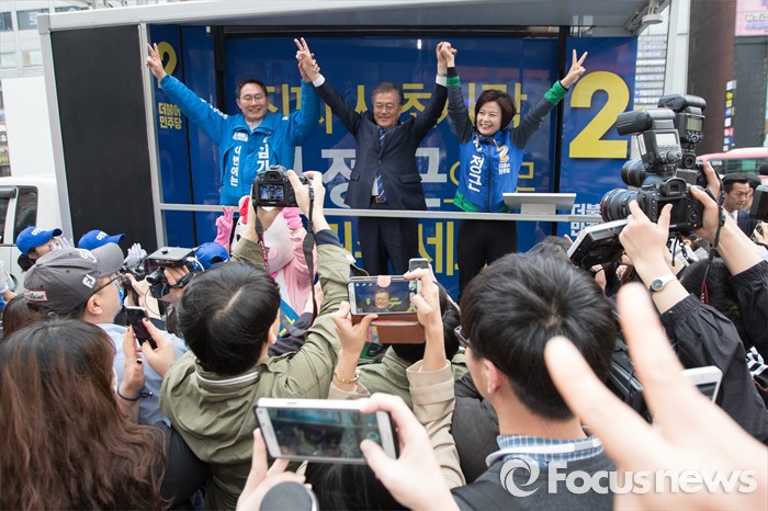 (서울=포커스뉴스) 문재인 더불어민주당 전 대표가 10일 오후 서울 CGV 강남점 앞에서 김기영 서초을 후보, 이정근 서초갑 후보와 함께 유권자들에게 지지를 호소하고 있다.