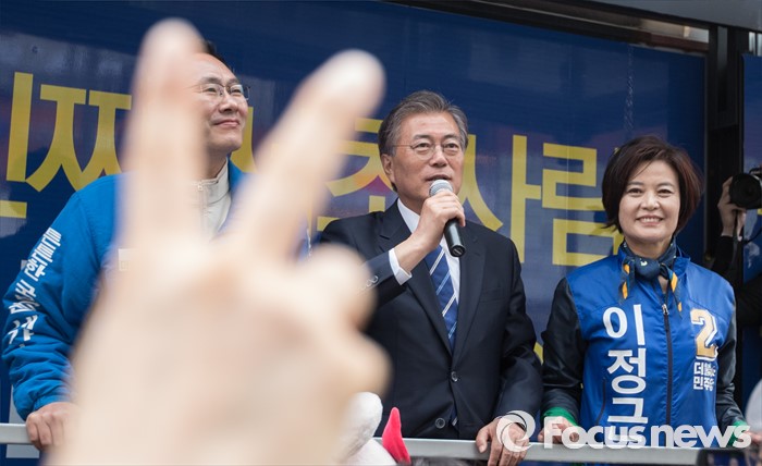 (서울=포커스뉴스) 문재인 더불어민주당 전 대표가 10일 오후 서울 CGV 강남점 앞에서 김기영 서초을 후보, 이정근 서초갑 후보와 함께 유권자들에게 지지를 호소하고 있다.