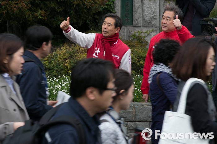 (울산=포커스뉴스) 김무성(오른쪽) 새누리당 대표가 11일 오전 울산시 동구 현대중공업 앞에서 안효대 울산 동구 후보 지원유세를 하고 있다.