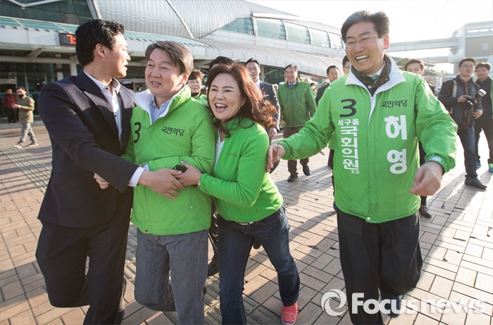(인천=포커스뉴스) 안철수 국민의당 상임공동대표(오른쪽 세번째)가 인천 서구을 허영 후보와 함께 11일 아침 인천시 서구 검암역에서 선거운동을 하고 있다.