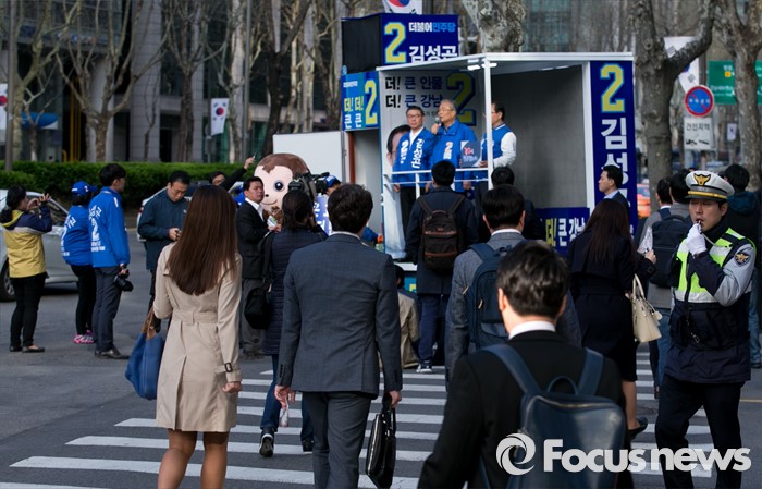 (서울=포커스뉴스) 20대 총선을 이틀 앞둔 11일 오전 서울 지하철 선릉역 인근 거리에서 김종인(가운데) 더불어민주당 비대위 대표 겸 선대위원장이 김성곤(오른쪽) 강남갑 후보의 지지를 호소하고 있다.