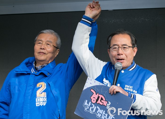 (서울=포커스뉴스) 20대 총선을 이틀 앞둔 11일 오전 서울 지하철 선릉역 인근 거리에서 김종인(왼쪽) 더불어민주당 비대위 대표 겸 선대위원장과 김성곤 강남갑 후보가 손을 들어 인사하며 지지를 호소하고 있다.