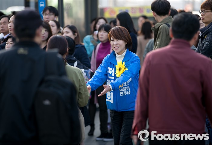 (서울=포커스뉴스) 20대 총선을 이틀 앞둔 11일 오전 서울 지하철 수서역 인근 거리에서 전현희 더불어민주당 강남을 후보가 유권자들과 인사하며 지지를 호소하고 있다.