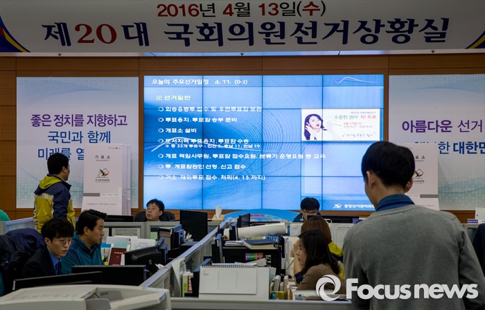 (과천=포커스뉴스) 4.13 총선을 이틀 앞둔 11일 오전 경기 과천 중앙선거관리위원회 내 제20대 국회의원선거상황실에서 선관위 직원들이 분주히 움직이고 있다.