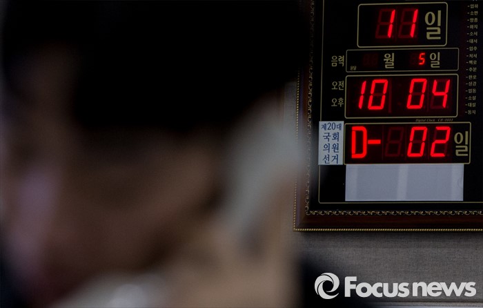 (과천=포커스뉴스) 4.13 총선을 이틀 앞둔 11일 오전 경기 과천 중앙선거관리위원회 내 제20대 국회의원선거상황실 시계에 D-2일이 표시되고 있다.