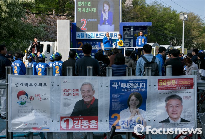 (서울=포커스뉴스) 20대 총선을 이틀 앞둔 11일 오전 서울 지하철 수서역 인근 거리에서 선거벽보 너머로 김종인 더불어민주당 비대위 대표 겸 선대위원장과 전현희 강남을 후보의 선거유세 모습이 보이고 있다.