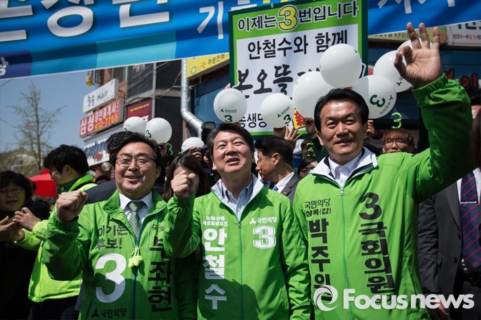 (안산=포커스뉴스) 안철수 국민의당 상임공동대표(가운데)가 11일 오전 안산시 단원구 고잔성당 사거리에서 부좌현 안산시 단원구을 후보 지원유세를 하고 있다.