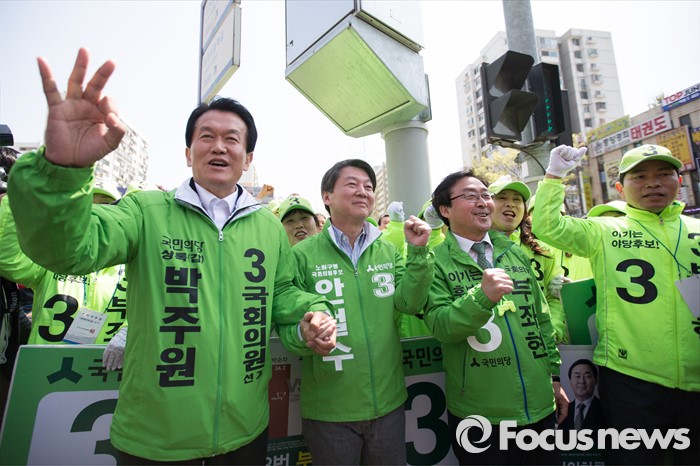 (안산=포커스뉴스) 안철수 국민의당 상임공동대표(가운데)가 11일 오전 안산시 단원구 고잔성당 사거리에서 부좌현 안산시 단원구을 후보 지원유세를 하고 있다.