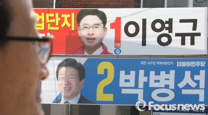 (대전=포커스뉴스) 20대 국회의원 선거를 이틀 남긴 11일 오전 대전 서구 흑석네거리에서 후보의 유세를 바라보는 시민 뒤로 새누리당 이영규, 더불어민주당 박병석 후보의 선거홍보 현수막이 붙어 있다.