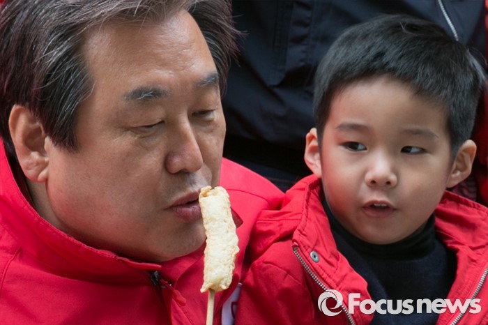 (부산=포커스뉴스) 제20대 총선에서 부산 중구영도에 출마한 김무성(왼쪽) 새누리당 대표가 11일 오후 부산 중구 국제시장 먹자골목 좌판 음식점에 앉아, 손자에게 어묵을 식혀주고 있다.