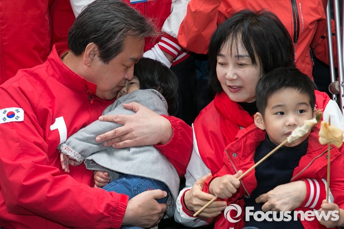 (부산=포커스뉴스) 제20대 총선에서 부산 중구영도에 출마한 김무성(왼쪽) 새누리당 대표가 11일 오후 부산 중구 국제시장 먹자골목 좌판 음식점에 앉아, 부인 최양옥 씨와 손자·손녀를 안고 음식을 먹고 있다.