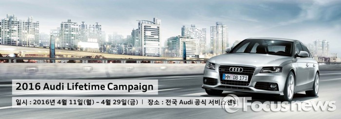 (서울=포커스뉴스) 아우디 코리아는 29일까지 3주간 만 4년 이상 아우디 차량을 소유한 고객을 대상으로 ‘2016 라이프타임 캠페인’을 진행한다고 11일 밝혔다.