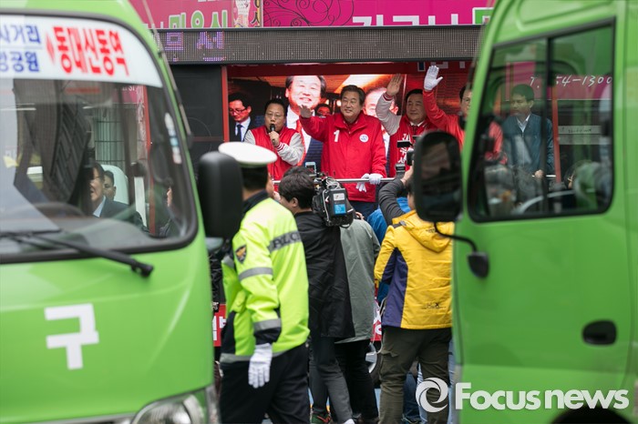 (부산=포커스뉴스) 제20대 총선에서 부산 중구영도에 출마한 김무성 새누리당 대표가 11일 오후 부산 중구 보수동 책방골목 앞에서 유세를 하고 있다.