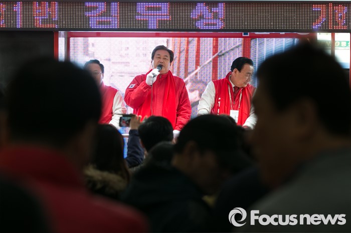 (부산=포커스뉴스) 제20대 총선에서 부산 중구영도에 출마한 김무성 새누리당 대표가 11일 오후 부산 중구 부평동 깡통시장 앞에서 유세를 하고 있다.