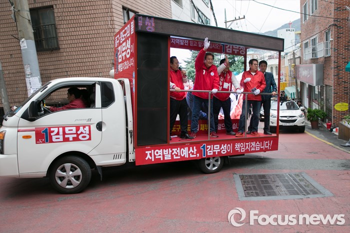 (부산=포커스뉴스) 제20대 총선에서 부산 중구영도에 출마한 김무성 새누리당 대표가 11일 오후 부산 중구 보수동 책방골목에서 유세차량을 타고 선거운동을 하고 있다.
