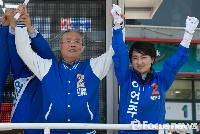 (광명=포커스뉴스) 20대 총선을 이틀 앞둔 11일 오후 경기도 광명 하안사거리에서 김종인(왼쪽) 더불어민주당 비대위 대표 겸 선대위원장과 이언주 광명을 후보가 지지를 호소하고 있다.