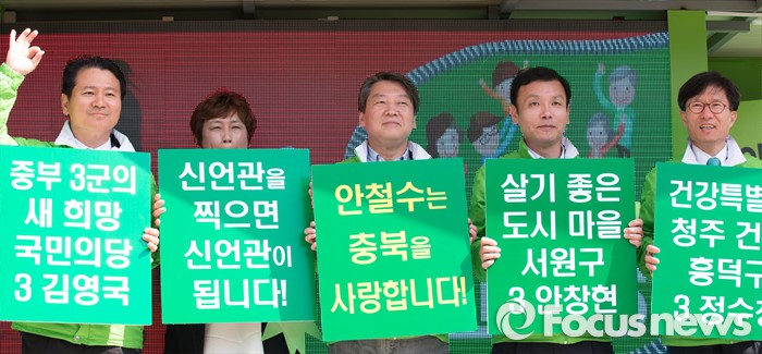 (청주=포커스뉴스) 안철수 국민의당 대표가 11일 오후 충북 청주시 사창사거리에서 20대 국회의원 충북도에 출마한 국민의당 후보의 지지를 호소하며 충북을 사랑합니다 피켓을 들어 보이고 있다.