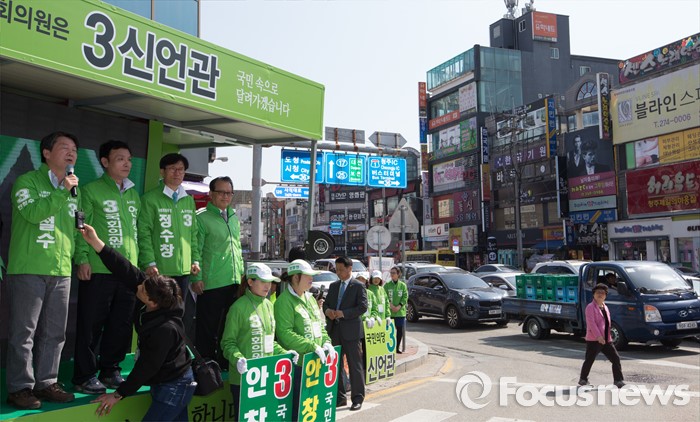 (청주=포커스뉴스) 안철수 국민의당 대표가 11일 오후 충북 청주시 사창사거리에서 20대 국회의원 충북도에 출마한 국민의당 후보의 지지를 호소하고 있다.