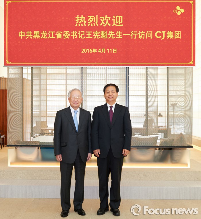CJ그룹은 1994년 중국 시장에 첫 발을 내딛은 이후 식품·식품서비스, 바이오, 신유통, 엔터테인먼트·미디어 등 4대 사업군을 모두 진출시켰다. 제2의 CJ를 건설하겠다는 목표로, 헤이룽장성 지역에서는 하얼빈에 연간 7만톤 생산 규모의 사료 공장과 CGV 3개 상영관을 운영하고 있다.11일 손경식 CJ 회장(왼쪽)이 CJ E&M센터를 방문한 왕셴쿠이 중국 헤이룽장성 당 서기(오른쪽)와 기념촬영을 하고 있다.<사진제공=CJ>