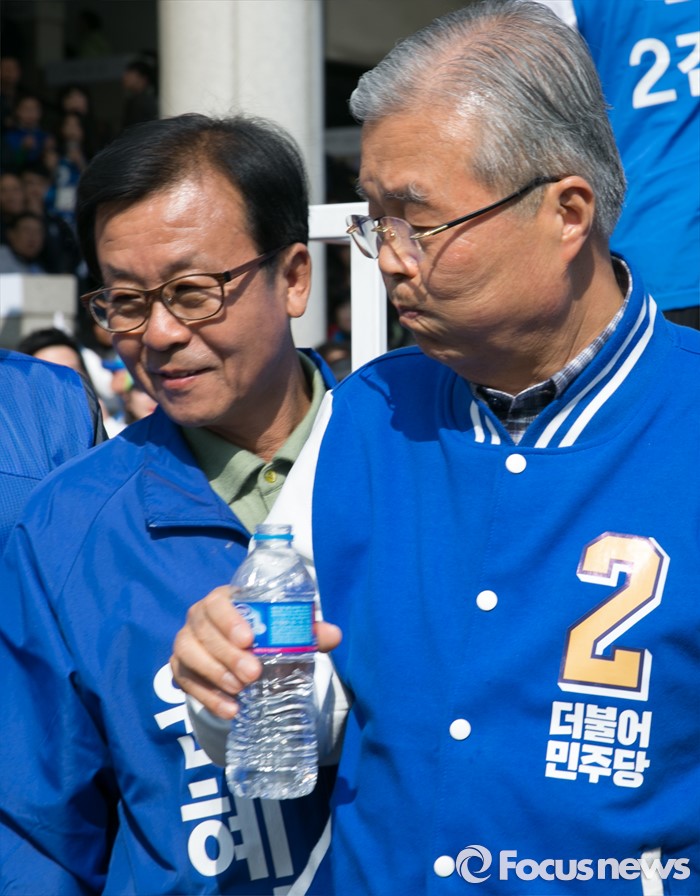 (부천=포커스뉴스) 20대 총선을 이틀 앞둔 11일 오후 경기도 부천역 남부광장에서 더불어민주당 부천지역 합동유세에 마친 김종인 비대위 대표 겸 선대위원장이 물을 마시며 이동하고 있다. 왼쪽은 원혜영 오정구 후보.