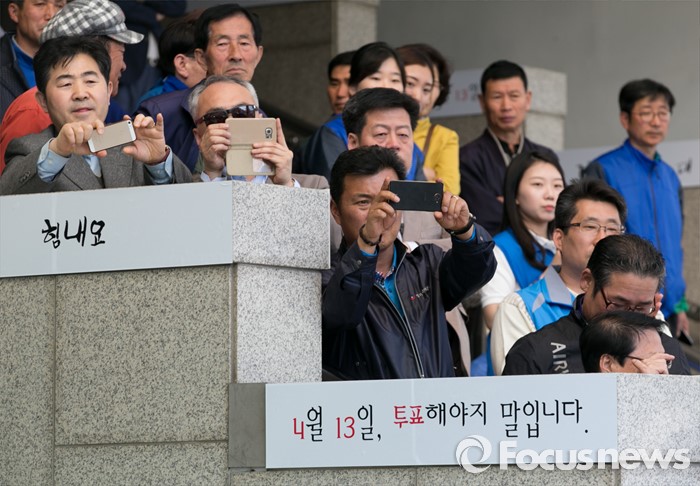 (부천=포커스뉴스) 20대 총선을 이틀 앞둔 11일 오후 경기도 부천역 남부광장에서 시민 및 지지자들이 더불어민주당 부천지역 합동유세를 지켜보고 있다.