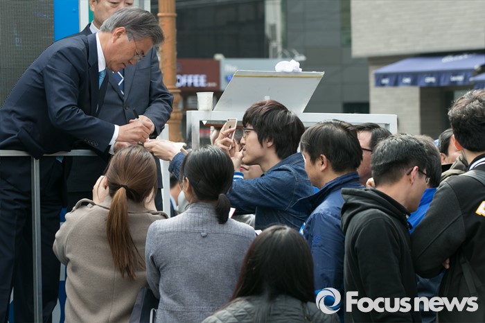 (부산=포커스뉴스) 문재인(왼쪽) 전 더불어민주당 대표가 11일 오후 부산시 사상구 가야대로 주례럭키아파트 앞에서 배재정 더불어민주당 사상 후보 지원유세를 마친 뒤, 시민들에게 사인을 해주고 있다.