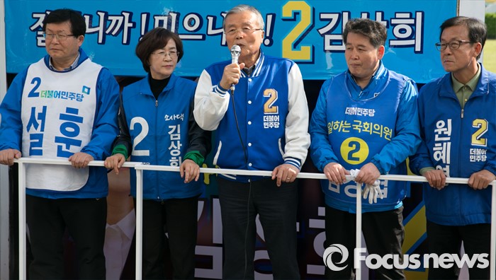 (부천=포커스뉴스) 20대 총선을 이틀 앞둔 11일 오후 경기도 부천역 남부광장에서 열린 더불어민주당 부천지역 합동유세에 참석한 김종인 비대위 대표 겸 선대위원장이 지지를 호소하고 있다. 왼쪽부터 설훈 원미을, 김상희 소사구 후보 ,김 대표, 김경협 원미갑, 원혜영 오정구 후보.