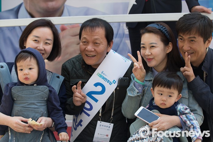 (서울=포커스뉴스) 11일 오후 서울 서대문구 청소년수련관 앞에서 영화배우 안내상, 우현씨가 우상호 더불어민주당 서대문구갑 후보를 지원하기 위해 시민들과 기념촬영을 하고 있다.