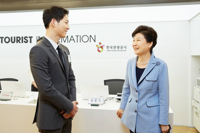 (서울=포커스뉴스) 박근혜 대통령은 11일 오전 서울 중구 한국관광공사 서울센터에서 열린 K-스타일 허브(K-Style Hub) 한식문화관 개소식에서 배우 송중기와 대화를 나누고 있다. <사진출처=청와대>