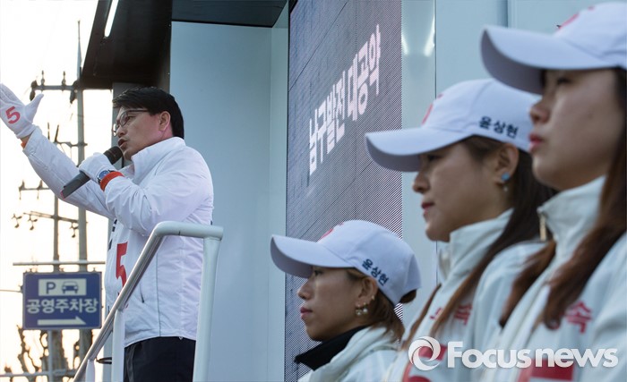(인천=포커스뉴스) 20대 총선을 이틀 앞둔 11일 오후 인천 남구 제물포역 앞에서 윤상현 무소속 남구을 후보가 유권자에게 지지호소 하고 있다.