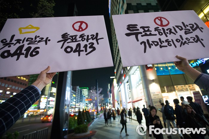 (서울=포커스뉴스) 11일 오후 서울 서초구 강남역 일대에서 세월호 진상규명 서명 시민지킴이들이 투표참여 캠페인으로 피켓팅을 하고 있다.